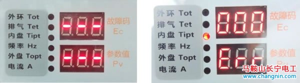 6、 如果外環(huán)溫、外盤(pán)管、內(nèi)盤(pán)管傳感器開(kāi)路或是異常時(shí),當(dāng)檢測(cè)到相應(yīng)傳感器時(shí), PV 數(shù)碼管會(huì)顯示 Err,代表該傳感器出現(xiàn)故障。